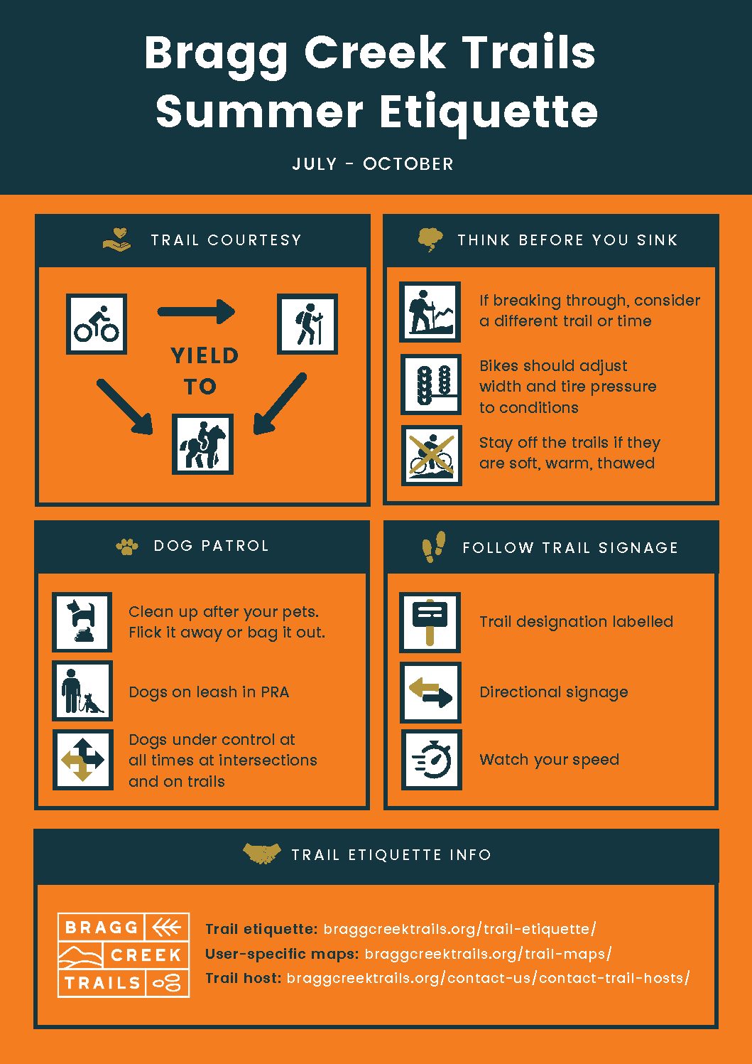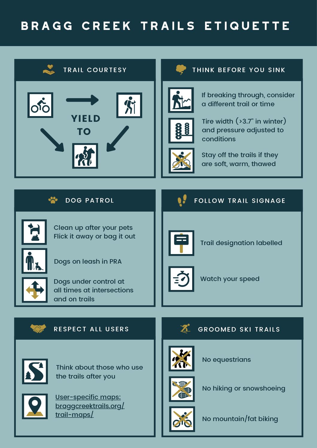 The West Bragg Creek trail network is a multi-use system designed for all to enjoy. We welcome a variety of activities and encourage users to be mindful of trail etiquette and the experience of others. Below are some guidelines for specific uses: