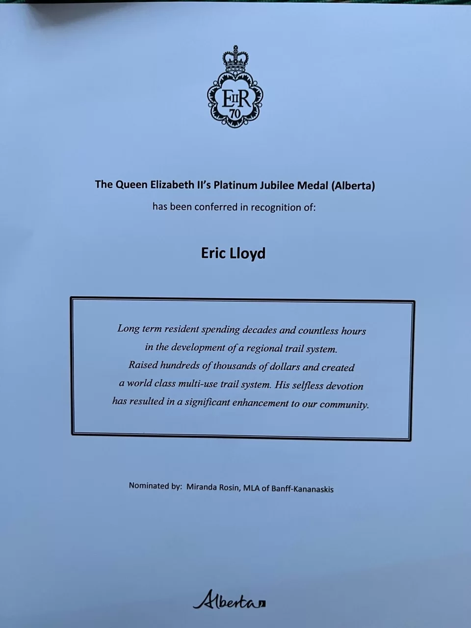 Eric was recently awarded the prestigious Queen Elizabeth II’s Platinum Jubilee Medal for his achievements and contribution to trail work. Goodness knows, if we sang the praises of his commitment and hard work over the decades, we’d lose our voices pretty quickly. Here is a brief synopsis: