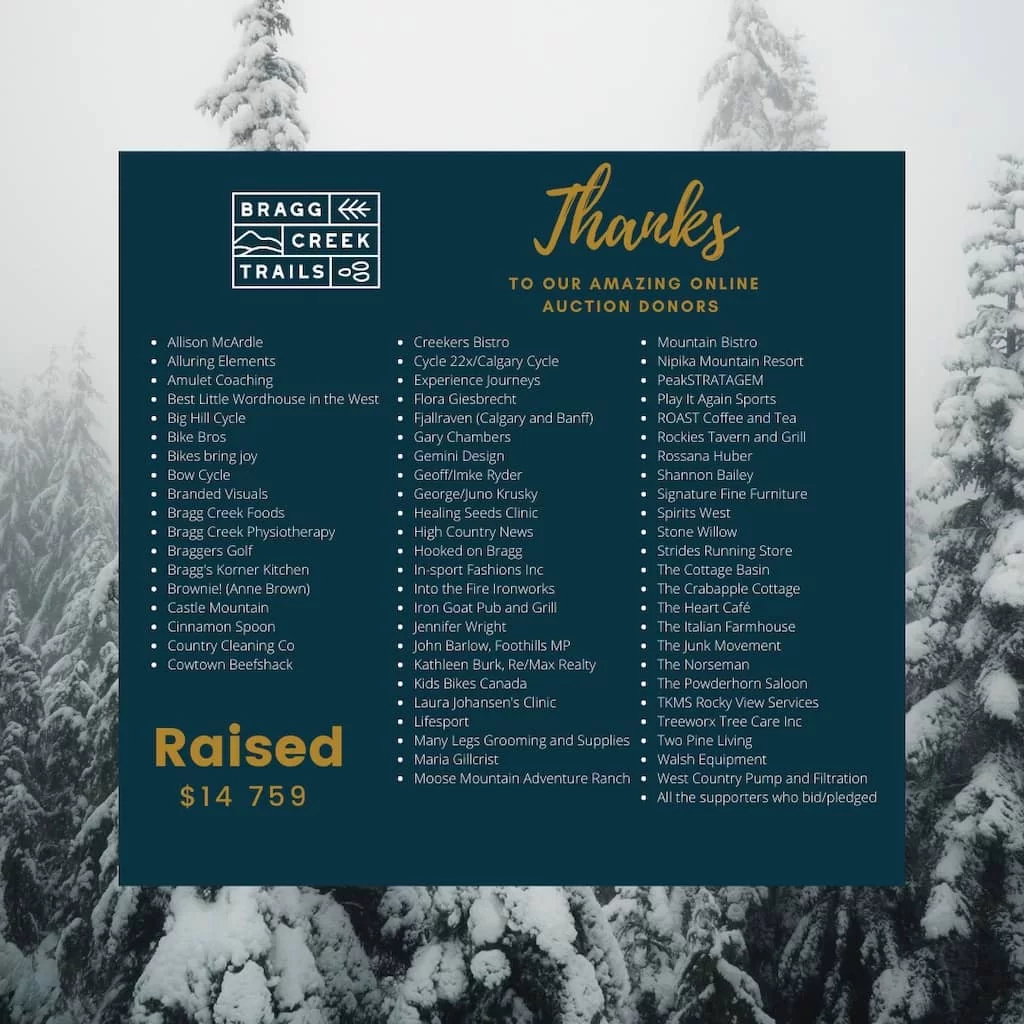Huge Shoutout to our Amazing Donors for the Bragg Creek Trails Online Auction