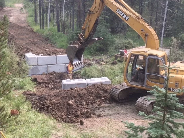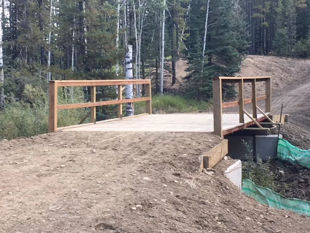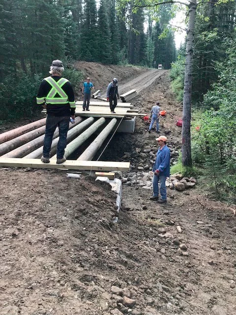- In partnership with Bragg Creek Excavating the GBCTA completed installation of 2 new bridges to cross creeks that previously had culverts which chronically froze creating dangerous ice flows. These were among the biggest projects GBCTA volunteers have ever undertaken involving the transport to site and placing of 64 tons of concrete bridge abutment blocks and over 8 tons of telephone pole bridge stringers and decking material . To address environmental concerns prior to construction bridge sites were isolated with temporary dams, the areas were electro fished and brook trout removed, silt fence was installed and after completion all disturbed areas were re seeded with AEP approved native grass mix.