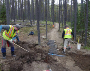 Trail builders add an up-slope V trench to direct water into a culvert and prevent trail braiding and widening. Alf Skrastins photo.