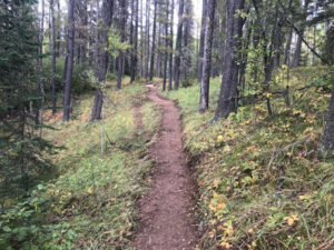 The Watershed Heritage Trail, completed in late 2018, is an excellent example of a trail built using best practices. The 500-metre one-way stretch of singletrack starts at the east end of the West Bragg Creek parking area and winds its way up to the site of the former West Bragg Creek Hostel.